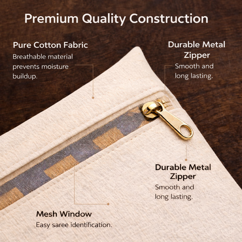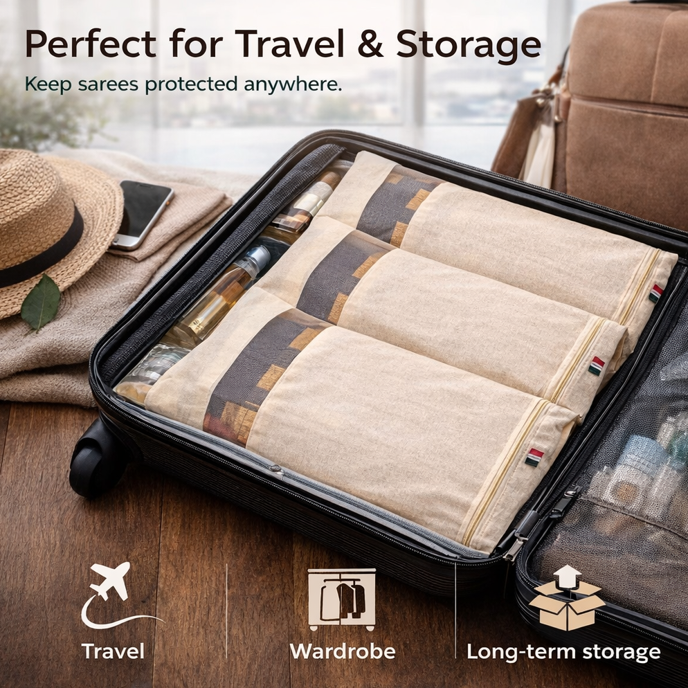 Sarees left on open shelves collect dust, go yellow, lose their shine. These cotton covers stop that. Simple.